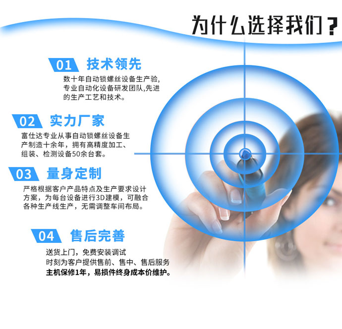 富仕達擁有獨立研發設計團隊,10多位自動化高級工程師,5000㎡自動鎖螺絲機生產、測試車間,專業售后服務團隊,為客戶提供方案設計、設備制造、操作培訓、售后服務等一站式服務。 公司將持續提升技術創新和產品服務方面的優勢,堅持“專業、精工、服務”的企業理念,聚焦于自動鎖螺絲設備生產,通過系統的一站式解決方案,真正的幫助客戶提升效率、降低成本,提升客戶的核心競爭力。